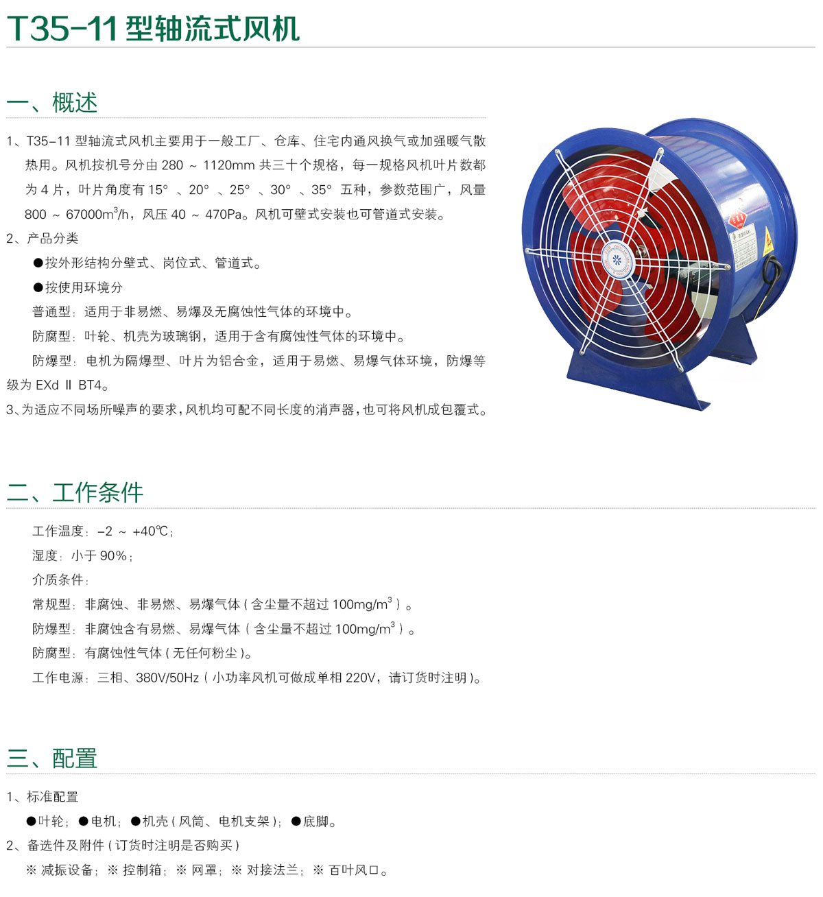 T35-11軸流風機主要用于一般工廠、倉庫住宅內通風換氣或 暖氣散熱用,可壁式安裝也可管道式安裝,按使用環境分為普通型、防腐型、防爆型。T35-11型軸流風機主要用于工礦企業,民用建筑的壁式排風、崗位送風、管道通風、屋頂通風等,應用于化工、輕工、食品、醫藥、冶金等工礦企業及各類民用建筑的通風空調系統。