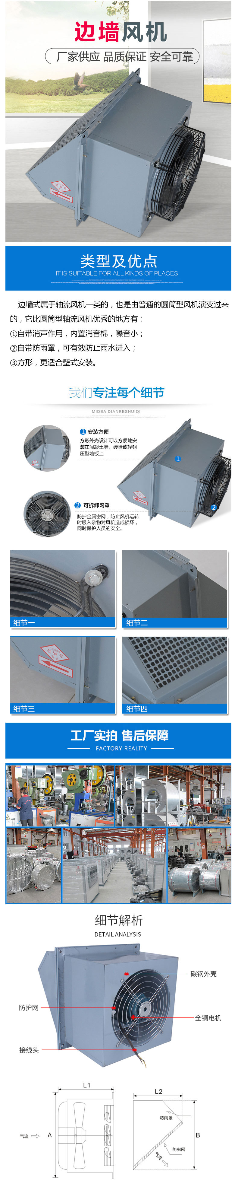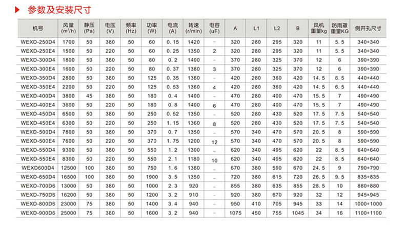 邊墻風機采用先進的前掠型葉片、低噪音的外轉子或內轉子風機專用電機直聯傳動,方形外殼設計可以方便地安裝在混凝土墻、磚墻或輕鋼壓型墻板上,方形防雨罩結構牢固,外形美觀